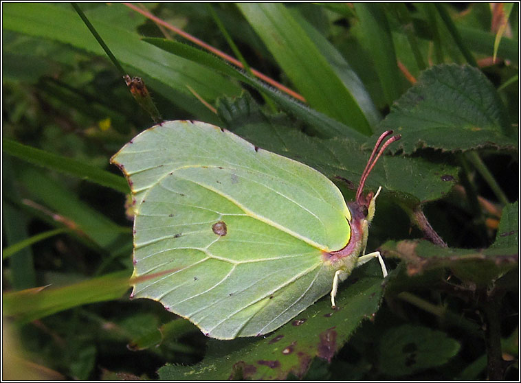 1546 * Gonopteryx rhamni * Brimstone Common in southern England, local in Wales and Ireland. Occasional in Scotland Wingspan: 60mm Flight time: Two generations, August-November and March-June Habitat: Woodland, scrub and gardens Larval foodplants: Alder Buckthorn and Purging Buckthorn |