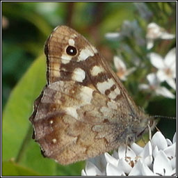 1614 * Parage aegeria * Speckled Wood Widespread, common Wingspan: 47-50mm Flight time: April-September, two broods Habitat: Shady hedgerows, woodlands Larval food plants: Grasses; Cock's-foot, Yorkshire Fog, False Brome |