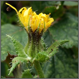 Bristly Ox-tongue Helminthotheca echioides (Picris echiodes) Flowering time: June - October. Annual or biennial Often coastal in fields, waste ground, disturbed roadsides. Widespread S and SE England, less frequent further north, rare in Ireland. Distinctive heart-shaped, bristly outer bracts surround the yellow flowerheads. Achenes have a long, slender beak. Stout prickly-hairy stems, the oblong-lanceolate leaves covered with stiff, bristly hairs with swollen whitish bases. Height to 100cm Similar: Hawkweed Oxtongue, Picris hieracioides |