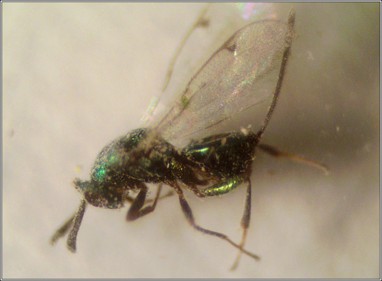 Torymidae - Torymus notatus Male and female emerged from Andricus curvator (sexual) galls on Quercus Robin Williams (Oak Galls in Britain) lists 4 iniquilines and 15 parasitoids: Synergus albipes, S. crassicornis, S. gallaepomiformis, S. nervosus, Eurytoma brunniventris, Megastigmus dorsalis, Torymus flavipes, T. geranii, T. notatus, Mesopolobus albitarsus, M. amaenus, M. fasciiventris, M. fuscipes, M. sericeus, M. tibialis, Eupelmus urozonus, Aulogymnus arsames, A. gallarum, A. gallarum f. pulchra. |