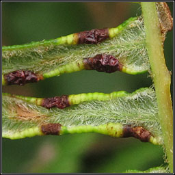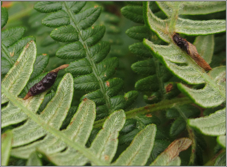 Dasineura pteridis Photographs on Pteridum aquilinum, Bracken Host: Pteridum aquilinum Distinctly thickened downward roll on one or both sides of pinnule. Gall becoming brown or black with a single larva in each roll (white becoming pinky-orange when mature). Several generations from June onwards. Similar: Dasineura pteridicola; inconspicuous downward fold, pinnule barely thickened. One or more larvae, white when mature. Single generation, early summer. Needs rearing and expert examination to confirm |