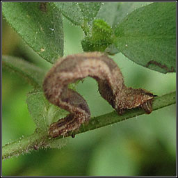 Widespread, common Wingspan: 17-21mm. Forewing with conspicuous central spot. Male has dark plate with two long pincers at 8th abdominal segment. Season: May-August Habitat: Gardens, hedges, woods, heaths and wetlands Larvae feed on flowers and leaves of a range of herbaceous plants Similar: Golden-rod Pug. 8th segment paler, without long extentions |