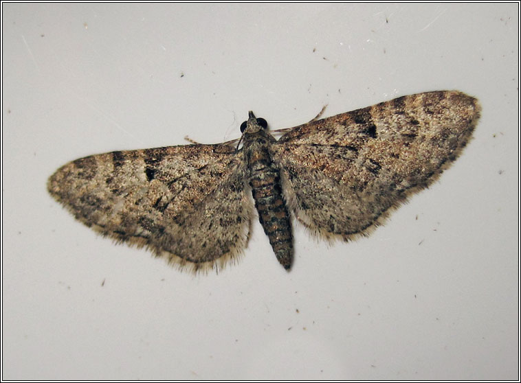 Wingspan: 16-22mm Season: Mid April - early June Habitat: Old woodlands, scrub and hedgerows Larvae feed on Hawthorn berries and leaves and on the leaves of Pendunculate Oak Similar: 1852 Brindled Pug and 1857 Dwarf Pug |
