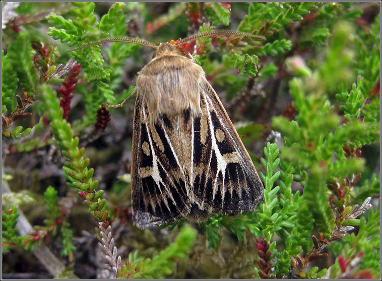 Nationally can be locally common, infrequently recorded in Dorset Wingspan: 27-39mm. Black streaks can be variable Season: July-August Habitat: Open acidic grasslands, heaths and moorland. Occasional on chalky soils with Sheep's Fecscue Larvae feed on grasses including Sheep's Fescue and Purple Moor-grass |