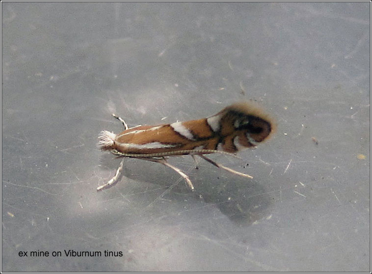 Adult ex mine on V. tinus Wingspan: 9mm Flight time: May and August Food plants: Viburnum spp. Mine: July and September-April Lower surface tentiform mine, usually between two side veins. The lower surface is creased, initially whitish then becoming brown. |