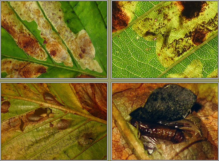 Wingspan: 8mm. First UK record was in SW London in 2002 Flight time: Probably three generations Food plant: Horse-chestnut (Aesculus hippocastanum). Also Acer spp. Mine: May-October The egg is laid on the upperside, usually near a vein. A small corridor leads to a large, elongate, upperside blotch, usually between veins. Blotch is cinnamon-coloured with a dark centre and many mines can occur on each leaf, causing serious defoliation. N.B. The fungus Guignardia aesculi is very similar and can cause confusion |