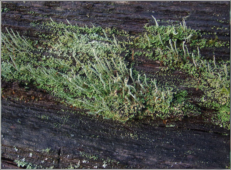 Cladonia coniocraea Primary thallus squamulose, secondary thallus fruticose. Chemical results: K-, P+ red Pollution resistant. Common in woods on mossy trees or rotting wood. The basal squamules, often +/- sorediate, can form large patches. Podetia are narrow, +/- squamulose at base, becoming sorediate above, the tips pointed or with small, narrow cups. Often found with (and can appear similar to) Cladonia ochrochlora |
