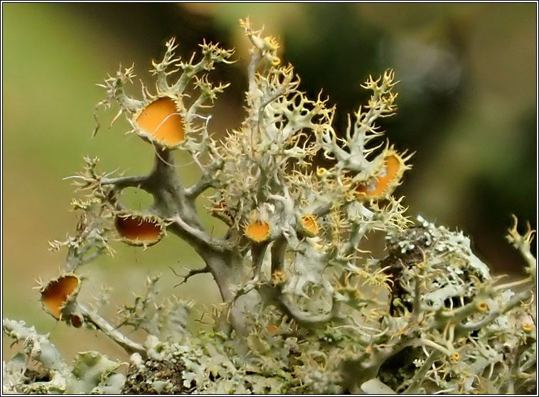 Teloschistes chrysophthalmus Growth type fruticose Chemical results: K+ purple A rare mediterranean species found on sheltered, nutrient-rich, well-lit twigs. Recent records from the south coast and southern Ireland. BLS conservation evaluation: CR B, C2, D NR P Compact thallus with tufts of flattened, radiating, irregularly branched lobes. Upper surface of lobes is yellow-orange, the lower surface greyish. Usually abundantly fertile, the bright orange discs are surrounded by conspicuous, eye-lash like fibrils. Soralia are absent. Similar: T. flavicans, lobes with sorediate margins. Apothecia rare |