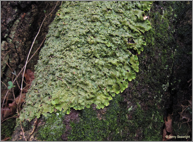 Ricasolia amplissima (Lobaria amplissima) Growth type foliose Chemical results: Medulla K+/- pale yellow, C-, KC+ deep pink, P- Trunks and main branches of Ash, Oak and Sycamore in old, usually oceanic woodlands. Rare in SW England, absent east of the New Forest. BLS conservation evaluation: LC Sc L IR. NIEC 'Old woodland' indicator Green wrinkled or smooth lobes (drying greyish-white), the thallus irregularly branched or forming large rosettes. Large dark blue-green to brown-black cephalodia are usually present |