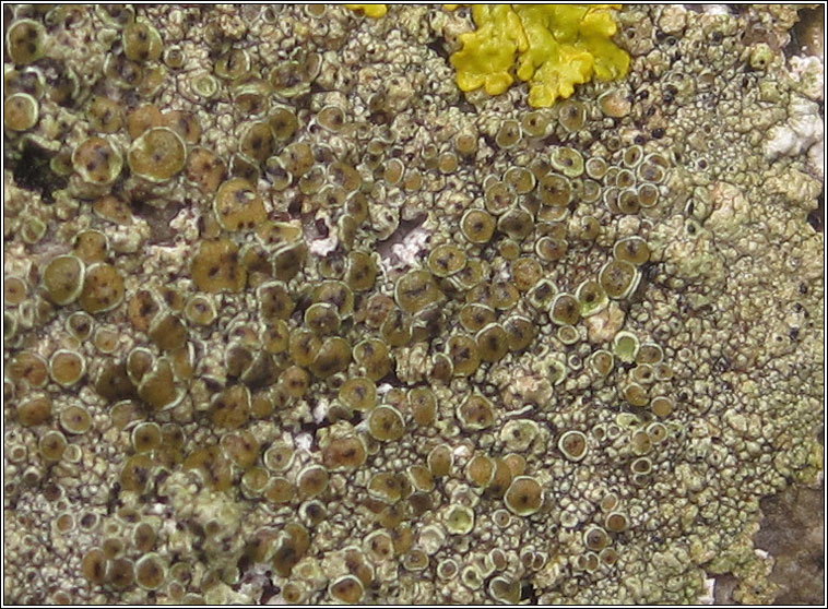 Muellerella lichenicola Growth type crustose, usually lichenicolous Recorded on a number of crustose lichen genera including Caloplaca, Catillaria, Lecanora, Mycobilimbia, Protoblastenia and Verrucaria. Usually occurs on species on calcareous substrates. Many small, black, globose perithecia develop on host thallus. The asci are multi-spored (64-100 spores), spores 1-septate, 5.5-7 x 3-3.5 µm. Pycnidia +/- immersed, conidia hyaline, 3-3.5 x 1-1.5 µm. Micrographs below. Similar: Muellerella pygmaea. Asci with 16-64 larger spores, 8-10 x 4-5 µm. Usually found on crustose saxicolous lichens. |