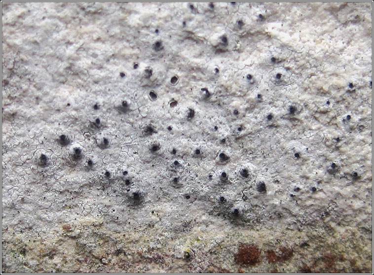 Verrucaria muralis Growth type crustose Chemical results negative Common on bricks, mortar, soft limestone rocks and pebbles and on shells White to greenish-white thallus, immersed, smooth or cracked. Black perithecia are immersed or prominent, leaving shallow pits in substrate. Spores (17-)20-24(-27) x (7.5-)10-12.5(-14.5) µm. Microscope photographs below. Host to Opegrapha hochstetteri |