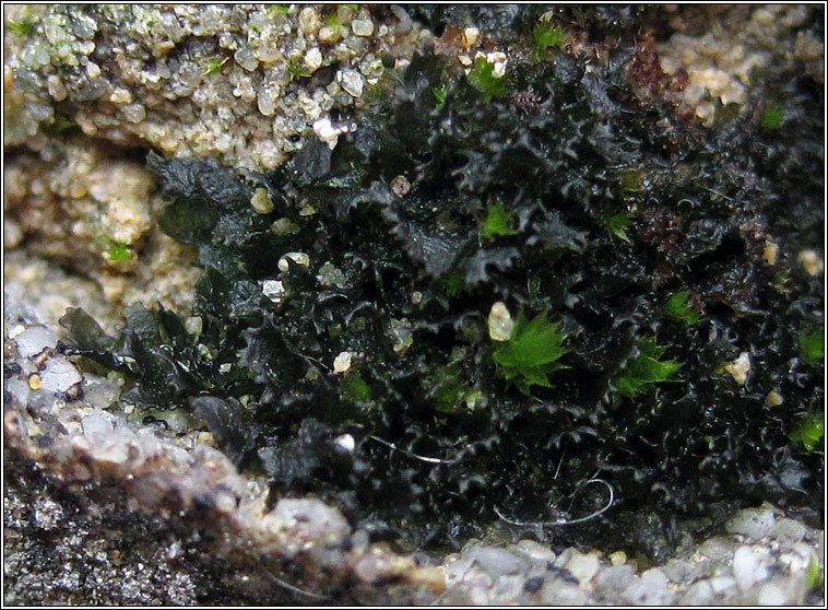 Scytinium gelatinosum (Leptogium gelatinosum) Growth type foliose Chemical reactions negative Widespread, occurs among mosses on calcareous rocks, dunes and soil and on mortar. Occasional over moss at base of trees. The most frequent Leptogium in southern and western Britain and Ireland. Can be variable. The brown or greenish-brown lobes usually erect and wrinkled with entire or lanceolate margins. Usually fertile, apothecia to 1.5mm, discs red-brown or brown. Isidia are absent. Similar: Leptogium pulvinatum. Smaller more divided lobes. |