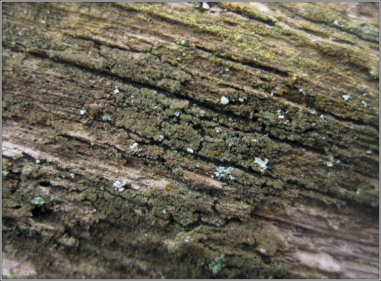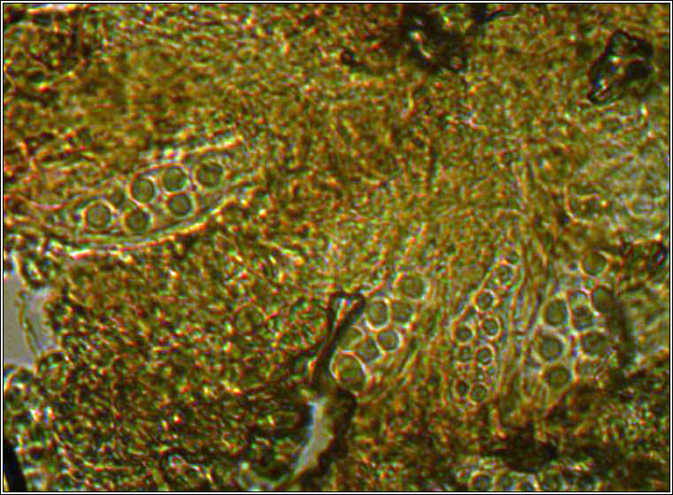 Placynthiella icmalea Growth type crustose. Chemical results: C+ red, KC+ red (best seen under microscope) Common on dead wood, tree stumps and damp fence posts. Also found on shaded siliceous rocks and damp, humus-rich soils. Thallus of very small brown to greyish-brown, isidiate or minutely coralloid granules. Often sterile, when present apothecia scattered, discs brown with persistent margins. Spores simple, often with oil drops, 8-12 x 4-5.5 µm. Microscope photographs below. Similar: P uliginosa. C-. Discs pinkish to dark red-brown, spores larger |
