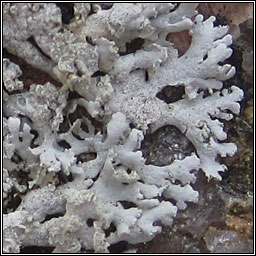 Physcia dubia Growth type foliose Chemical results: Cortex K+ yellow, medulla K- Found on nutrient-enriched siliceous rocks, walls and bricks. Greyish thallus, the narrow, radiating lobes with terminal, lip-shaped soralia. Marginal cilia absent. Similar: Physcia caesia. Basic substrates, cortex and medulla K+ yellow. Physcia tenella has marginal cilia |