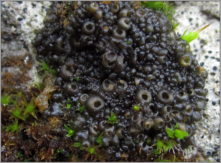 Scytinium turgidum (Leptogium turgidum) Growth type foliose. Chemical results negative Probably under-recorded on calcareous soil and walls, and also found on crumbling mortar. Shiny, thickish dark-olive to reddish-black thallus with small, turgid lobes that can appear shrubby, the upper surface often densely granular-isidiate. Apothecia either absent or abundant with concave discs. Spores 3-septate becoming muriform. Microscope photographs below. Intermediate morphs occur between Leptogium plicatile (with larger lobes) and Leptogium schraderi (cylindrical lobes) |