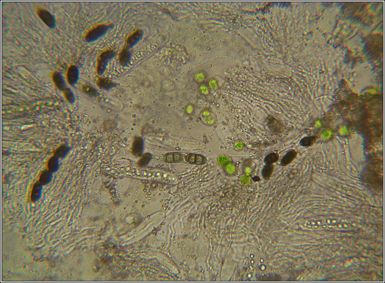 Diplotomma murorum # Chemical results negative Lichenicolous on Caloplaca teicholyta. BLS conservation evaluation: NE NR Diplotomma murorum and D. vezdanum are possibly both lichenicolous forms of D. alboatrum. The spores are initially septate, usually becoming submuriform, 20-22 × 7.5-9 µm. Microscope photographs below. Similar: Diplotomma vezdanum occurs on Caloplaca verruculifera |