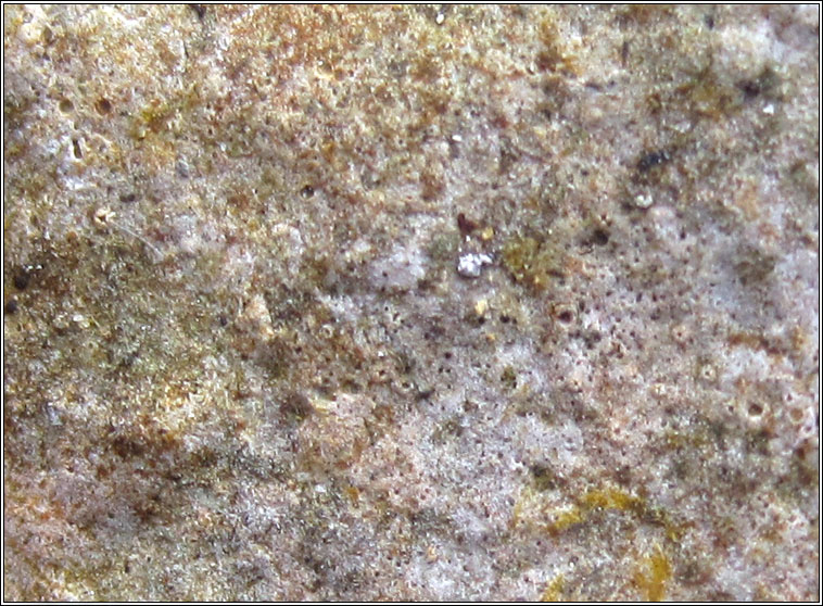Ramonia calcicola Growth type crustose. BLS conservation evaluation: DD NR Chemical results negative. Photobiont Trentepohlia Very rare, in Britain and Ireland only recorded from limestone on the Isle of Portland, Dorset. Also known from southern France and Spain Thallus thin, epilithic or partly endolithic, pink when fresh, pale green-grey in the shade. Apothecia immersed or slightly superficial, white with radially split margins, the discs pinkish to pink-orange. Asci are 8-spored, the spores 3-5(-7) septate with conspicuous perispore, (15-)18-23 x 4-6 µm Similar: Petractis nodispora, spores 3-septate, multicellular conidia |