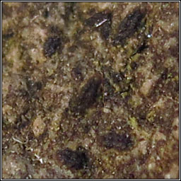 Gyrographa saxigena (Opegrapha saxigena) Growth type crustose Chemical results negative. BLS conservation evaluation: LC NS Sc IR On sheltered, deeply shaded siliceous rocks, especially in old woodlands. Occasional on smooth bark. Can be locally frequent in the SW and West. Mosaic-forming thin or partially cracked dark-chocolate to deep purplish brown thalli surrounded by a thin dark prothallus. Apothecia are often sparse, short, rarely branched, the disc a persistent slit. Spores 3-septate, (15-)16-20(-22) x 4-5(-6) µm. Soredia absent. Micrograph below. Similar: Gyrographa gyrocarpa is sorediate with gyrose apothecia |