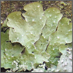 Punctelia reddenda Growth type foliose Chemical results: Cortex K+ yellow. Medulla C-. 'Old woodland' indicator usually found on mossy trunks in sheltered, humid woodlands. Also occurs on mossy rocks. Thallus is bluish-grey, grey-green or yellowish-green, lower surface black with brownish margins. Lobes dotted with white pseudocyphellae producing soralia with coarse, granular soredia. Small folioles often present but apothecia and pycnidia are absent in Britain and Ireland. Similar: Punctelia borreri, lobes dark beneath. P. subrudecta, lobes pale beneath. P. jeckeri, lobes pale brown beneath, tips pruinose |
