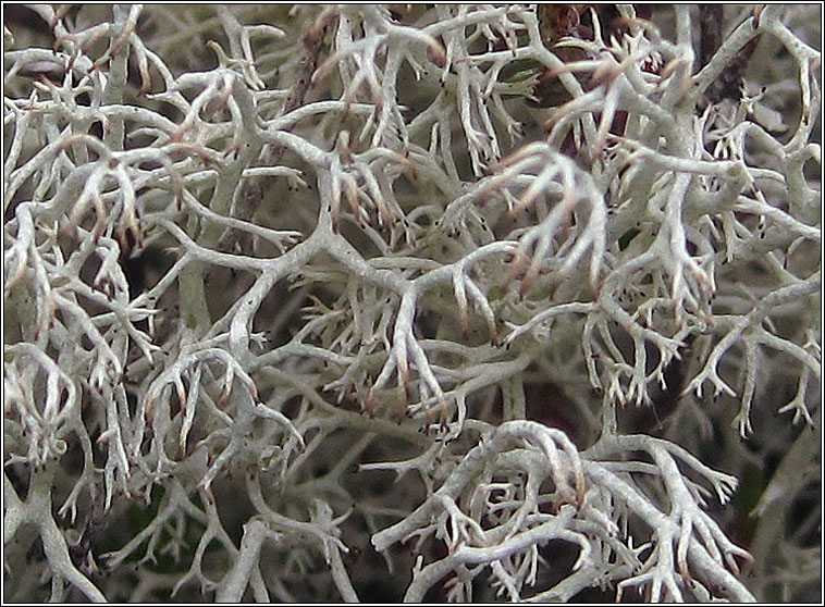 Cladonia ciliata Chemical results: K-, KC-, P+ red, UV- Can form large patches among heather stems on heathlands and bogs and amongst scree Primary squamules are absent. Podetia are pale ashy-grey to green-grey with brownish-purple tips turned down at ends and the tips more/less orientated in one direction. Branching is mainly in two's (dichotomous) with the axils rarely perforated. Very variable, with two recognised varieties: Cladonia ciliata var. ciliata Similar: Cladonia portentosa, the branching is +/- trichotomous, P-. Cladonia arbuscula, main branches strongly curved, P+ yellow |