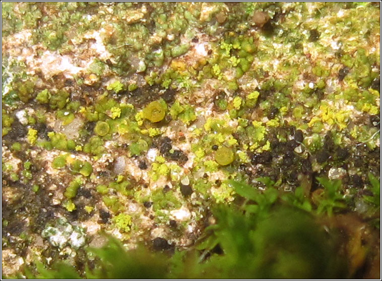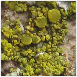 Flavoplaca flavocitrina (Caloplaca flavocitrina) Growth type crustose Chemical results: K+ crimson Common on cement, mortar, calcareous rocks and asbestos and also found on basic-barked trees. Thallus of contiguous or dispersed greenish-yellow areoles or small squamules, the margins splitting and forming soralia that can eventually cover the thallus. Soredia lemon-yellow and paler than thallus. Apothecia infrequent, slightly darker yellow than thallus. Micrograph below. One of the species in the Flavoplaca citrina aggregate. |