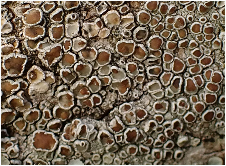 Lecanora argentata Growth type crustose Chemical results: K+ yellow, C-, Pd+ weak yellow, UV- Occurs on twigs, branches and trunks of mature deciduous trees Discs are red-brown, darker brown or sometimes piedbald with crystals in the margins but no granules in the epithecium (POL). The thallus is whitish, uneven or +/- warted and smooth at margins, usually with black prothallus visible. Micrographs under POL below. Similar: Lecanora chlarotera s.str. has large crystals in the margins and granules in the epithecium. Lecanora campestris and L. horiza only have small crystals in the margins. Lecanora intumescens has small crystals in the margins and granules in the epithecium |